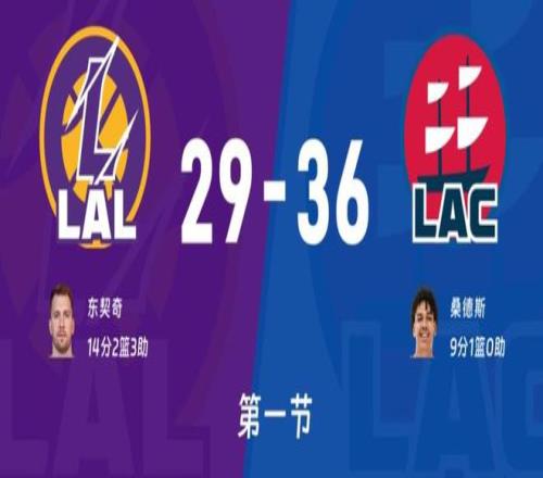 比赛开始湖人率先进攻,邓恩对位东契奇,小卡对位詹姆斯,艾顿对位祖巴茨,哈登防守斯玛特!拉拉维亚一上来就投中三分,快船进攻湖人这边斯玛特防守哈登,拉拉维亚对位小卡,詹姆斯防柯林斯,柯林斯反击上篮拉拉维亚三分再中,祖巴茨内线抛投4-6开局。斯玛特三分三不沾,祖巴茨内线抛投不中东契奇转换抛投来一个,小卡突然爆发连得8分快船反超,斯玛特篮下吃饼比分12平!哈登上篮被帽詹姆斯转换传球失误,中段双方依旧维持对攻态势,谁也无法甩开谁。哈登突破东契奇下手犯规,6分17秒官方暂停。回到比赛湖人挑战成功,詹姆斯冲击内线祖巴茨犯规两罚全中18-14领先4分,祖巴茨补篮桑德斯三分快船一波5-0反超1分,东契奇抛投止血,桑德斯三分再中一球,祖巴茨内线补篮得分快船反超4分,哈登盘活全队湖人这边只有东契奇单打,首节36-29快船领先7分!