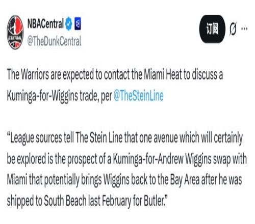 北京时间1月24日,在吉米-巴特勒遭遇赛季报销的前交叉韧带撕裂伤病后,金州勇士队针对交易截止日的运作思路已经浮出水面。名记Stein报道,勇士队有意探讨将前锋乔纳森-库明加交易至迈阿密热火队,从而换回安德鲁-维金斯的可能性。