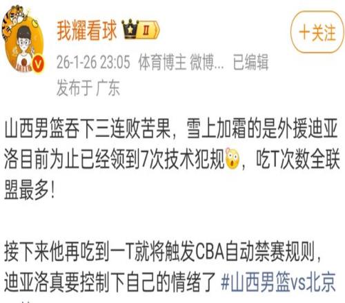 最近几场比赛,山西男篮的外援迪亚洛成为了风口浪尖的人物,几乎每场比赛他都会和对手发生冲突,当然,迪亚洛肯定是被针对的,甚至是一些战术故意激怒他。和北京首钢的比赛结束后,迪亚洛赛季累计了7次技术犯规,根据规则,第8次将会被禁赛一场,随后每两次就会被禁赛1场。