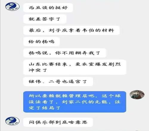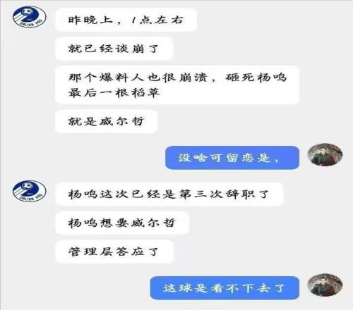 事后球迷评论区,有球迷晒出了一张和“知情人”聊天的截图,据“知情人”透露,这不是杨鸣第一次选择辞职,而是第三次,“砸死”杨鸣的最后一根稻草,就是威尔哲,之前杨鸣想要管理层引进威尔哲,管理层答应了,并且双方就差签字了,但到了最后,总经理刘子庆却出尔反尔,拿着韦伯的材料给杨鸣,杨鸣表示:你不用糊弄我了。