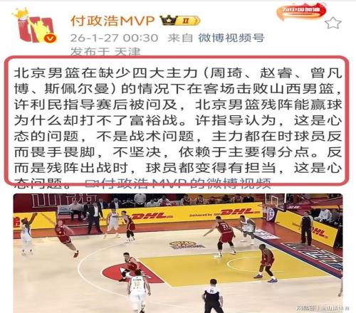 残阵北京击败山西赛后,付政浩发文称:北京男篮在缺少四大主力(周琦、赵睿、曾凡博、斯佩尔曼)的情况下在客场击败山西男篮, 许利民指导赛后被问及,北京男篮残阵能赢球为什么却打不了富裕战。许指导认为,这是心态的问题,不是战术问题,主力都在时球员反而畏手畏脚,不坚决,依赖于主要得分点。反而是残阵出战时,球员都变得有担当,这是心态问题。