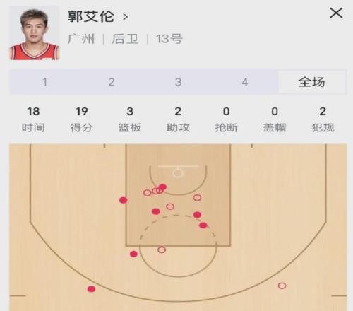 对阵青岛男篮,郭艾伦替补出战18分钟左右,14投7中拿下19分3篮板2助攻,尽管最后关头的罚球丢了一个,但并不影响广州龙狮男篮涉险过关。