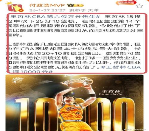 赛后,CBA发文祝贺王哲林:上海男篮球员王哲林在今晚主场对阵广州朗肽海本的比赛中,全场得到25分,在他职业生涯的第489场比赛中总得分突破万分大关,成为CBA联赛历史上第6位得分破万的球员,恭喜王哲林!