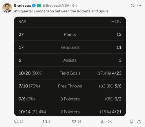 火箭记者Bradeaux晒出末节火箭与马刺的数据对比,马刺27分-火箭13分,篮板马刺也赢下6个,助攻马刺赢下6个,马刺命中率50%,火箭命中率17.4%,火箭末节23中4是本赛季最差的一节。