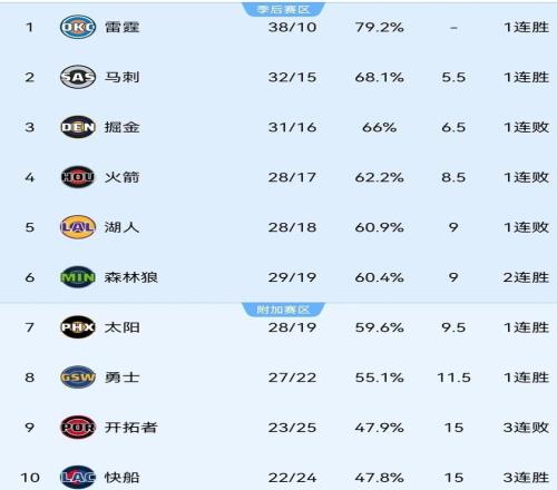 目前为止,火箭以28胜17负排名西部第四,仅领先第五的湖人(28-18)0.5个胜场,领先第六的森林狼(29-19)和第七的太阳(28-19)1个胜场,正面临着掉出季后赛区域的危险。