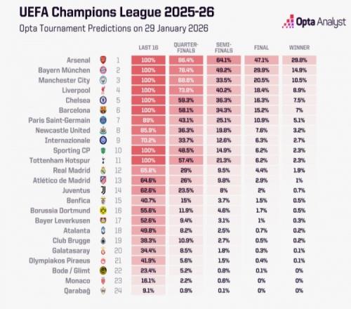 体育播报1月30日宣 欧冠联赛阶段已经结束了全部争夺,除了已经被淘汰的8支球队外,OPTA对剩余球队的夺冠概率进行了预测,阿森纳以29.8%居首,拜仁以14.9%位居次席。