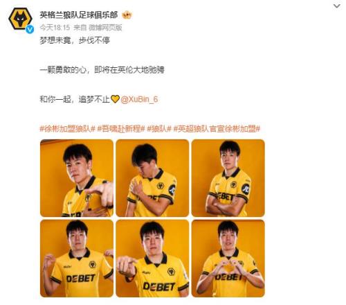 1月8日,徐彬正式加盟英超狼队,身价45万欧元