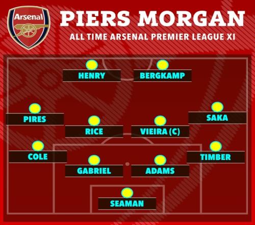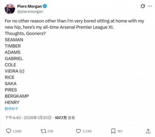 体育播报01月30日宣 名嘴皮尔斯·摩根今日发布社媒,作为知名枪迷的他评选出了阿森纳历史最佳11人,有萨卡等四名现役球员入选。具体名单如图。